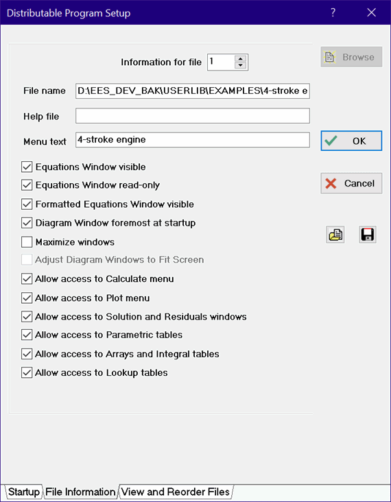 The File Information tab allows information to be entered for each EES file that you wish to include with the distributable program, as shown above. Select the file you wish to enter information for using the control at the top of the page. You must enter the name of the EES file in the first edit field. Use the Browse button to make this selection process easier. Note that you can select more than one file with the browse button for the file name field. In this case, the selected files will entered sequentially. The EES files will be copied into the distributable file that is created, so they do not need to be provided with the executable program. The next edit field allows you to enter the name of a help file that will provide help information specific to this EES program. The help file can be of four types: an ASCII text file (*.txt), a .pdf file, a Windows help file (*.chm) or an HTML file (*.htm). EES will automatically determine the file type independently of the file name extension. The Help file will be associated with a menu item appearing in the Help menu.