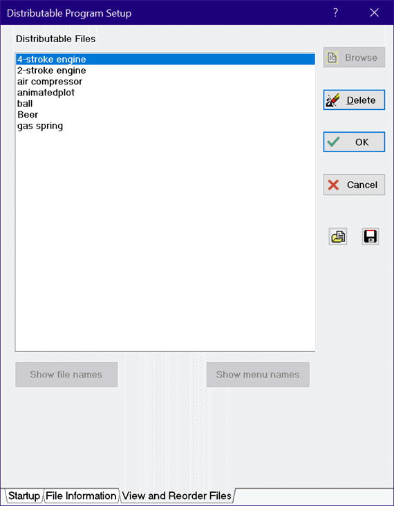 The View and Reorder Files table shows a list of all of the EES files that have been selected for inclusion in the distributable program. The files are initially shown with their shorter menu name, but the complete file names can be shown by clicking the Show menu names button. The files can be reordered in this window by clicking on a file name in the list and dragging it to its desired position. Clicking the Delete button will remove the file from the list. Note that a hyphen can be supplied as a file name. When the distributable program is started, the hyphen will be changed into a horizontal menu separator bar, allowing some order to be imposed in the list of files accessible by the distributable program.