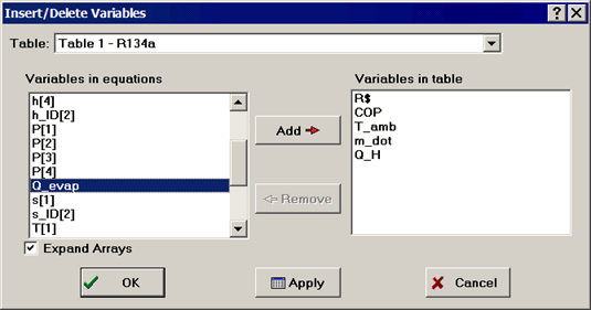 The "Variables in table" list on the right of the dialog shows the variables that currently appear in the selected Parametric Table. Variables that appear in the Equations window are shown in the "Variable in equations" list on the left. To add a variable to the selected Parametric Table(s), click on its name (or use the up/down arrow keys), causing it to be highlighted. Click the Add button to move the highlighted variable name to the list on the right. (Double-clicking the mouse on a variable name in the left list both selects that variable and adds it to the list on the right.) A variable can be deleted from the selected table by selecting it from the list on the right, followed by clicking on the Remove button or by double-clicking on the variable name.