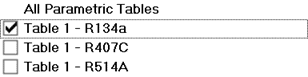 If there is more than one Parametric Table, the table name drop down control will provide an option to do calculations for one table, all tables, or selected tables. Clicking the table name drop down control will produce a drop-down check box display similar to the following.