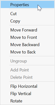 The pop-up menu provides a Properties menu item. Selecting the Properties menu item (or double-clicking on the item) will bring up the properties dialog for that item and then the characteristics of that graphic item can be changed by modifying the fields in the dialog. The properties dialog provides inputs for the location (top-left corner) and size of the graphic object.
