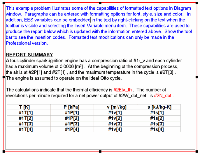 Formatted text items can be placed in the Diagram window and in child diagram windows. A formatted text item can consist of one or more lines of formatted text with embedded font, font size, font style, and font color information as well as graphics. The text item can include line breaks, tabs, equations and figures. The text item can also be a table, copied from a spreadsheet program. In addition, EES variables can be included in the text so that the current value of the variable is automatically displayed.