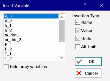 Select the EES variable you wish to insert from the list on the left. Typing the first letter of a variable will scroll the list to a variable beginning with that letter. Check the Hide array variables control to eliminate array variables from list. Indicate whether you wish to include the variable name and units (or alternate units) with the EES variable by clicking the appropriate radio button. In Development mode, EES will display the inserted variable with a #, followed by a number (depending which of the four radio button options was selected) and then the EES variable name. For example, if variable XYZ is inserted with its value and units, it will appear as #2XYZ in the formatted text item, as shown in red font following the words thermal efficiency above. When the Diagram window is in Application mode, the insertion indicator will be replaced with the current EES variable information.