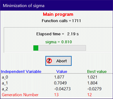 As mentioned previously, the genetic method is robust but slow. The number of function evaluations required is approximately equal to the product of the number of individuals and the number of generations. Setting the slider bar controls for the number of individuals and generations to their rightmost positions will result in more than 262,000 function evaluations. Depending on the complexity of the objective function, the calculations may require just short of forever to complete. The progress of the optimization is displayed during the calculations, as shown below. The best value of the objective function that has been found is displayed in green type below the elapsed time. The values of the independent variables that produced this optimum are shown in the 'Best value' column at the bottom right. The number of generations completed is represented by the progress bar above the Abort button. Should you tire of waiting for the calculations to complete, you can click the Abort button. The Solution window will then display the best point found up to time when the calculations were terminated.
