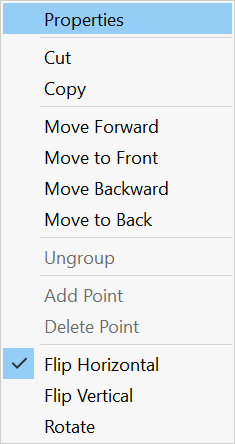 Select the Properties menu item to bring up a dialog that allows the attributes of the item to be changed. The dialog also allows a name to be assigned to the item use in animation. Note that the selected object can be flipped horizontally or vertically using the menu items in the popup menu or the check boxes in the Properties dialog.