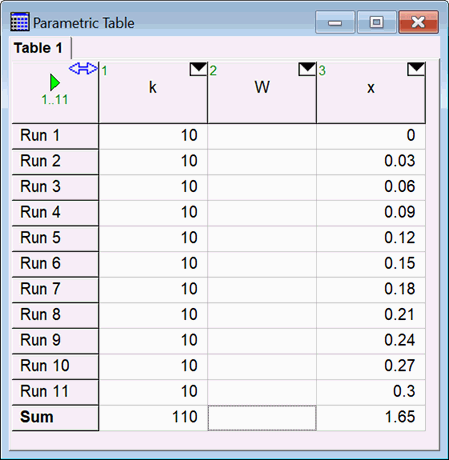 Create a Parametric table with columns for k, W, and x. Enter the values of k and x into the table as shown.