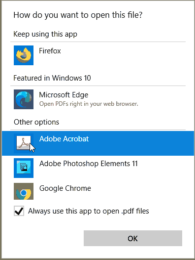 Finally, choose Adobe Reader or Acrobat (or any application other them Microsoft Edge) and check Always use this app to open .pdf files.