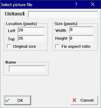 The Width and Height fields are automatically entered after the file name is selected. However, you can edit these fields to adjust the size of the picture as it appears in the Diagram window. Clicking the Original Size check box control forces the width and height of picture to be reset the values stored in the file. When this control is checked, the Width and Height controls are disabled.