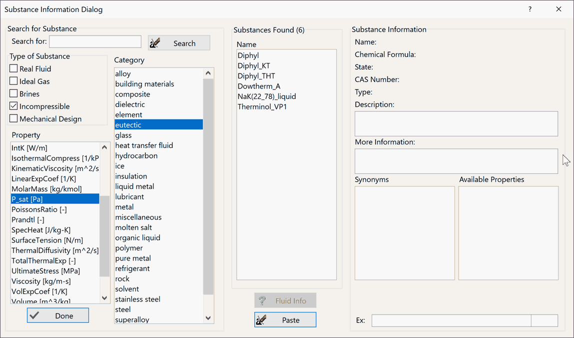 The left hand box allows you to create a search for a substance. Click one or more of the substance type check boxes in the upper left hand corner to filter your search by substance type. The types correspond to Real Fluids, Ideal Gases, Brines, Incompressible, and Mechanical Design. Based on the type of substance selected the two list boxes to the left will be populated. The left box vides a list of properties available and the right box provides a list of categories. By making selections in either of these boxes you can filter the list of substances that appear in the Substances Found box. For example, selecting the Incompressible type box, the P_sat function and the eutectic category provides a list of incompressible substances that are classified as eutectics and have the saturation pressure property available. Note that multiple properties or categories can be selected to further refine your search. Holding down the Ctrl^ key while making a selection will undo that selection.