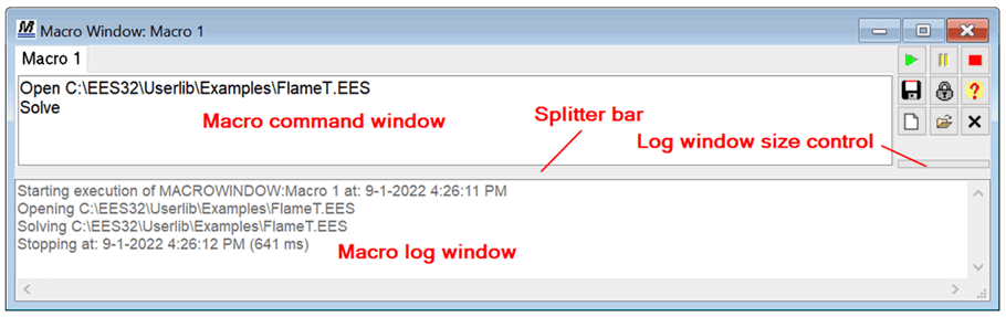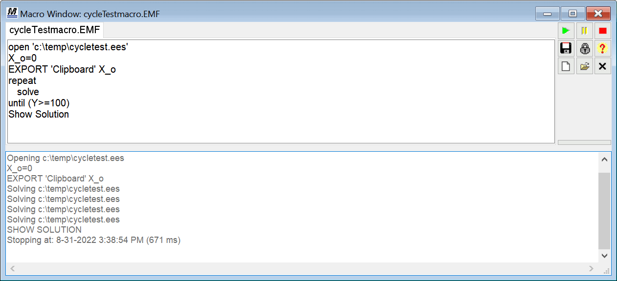 The macro command window is editable, so that you can modify the commands that appear in this window, add new commands or delete them if you wish. See the list of Macro Commands. Clicking the Play button will signal EES to play the macro commands that appear in the window starting at the top.