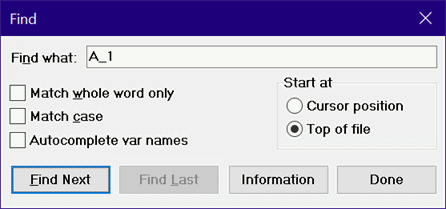 Find will search the Equations window for the first occurrence of the text entered in the 'Find what' input box. The search is case-insensitive unless the 'Match case' check box control is selected. The 'Match whole word only' check box control will, if checked, only find whole words which match the text. For example, if the text to find is A, text such as CAT will not be found when using 'Match whole word only'. If the 'Autocomplete var names' control is checked, the Find what edit box will suggest existing variable names that begin with the characters that have been entered.