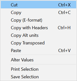 A range of cells in the table can be copied to the clipboard, after which they can be pasted into a different part of the table, into the Parametric Table, or into another application such as a word processor or a spreadsheet. One or more rows in the table can be selected by clicking the left mouse button in the row header column (the leftmost column). If the mouse is dragged to other rows while the left mouse button remains down, these rows will be added to the selection. A similar procedure can be use used to select one or more columns. An alternative way to copy a range of cells is as follows: Select the cell at the upper-left of the range by clicking the mouse button when the cursor is positioned in the cell. Now, hold the Shift key down and click in the cell at the lower-right of the range, using the scroll bars to bring it into view if necessary. At this point, you can either select Copy from the Edit menu or press the right mouse button to bring up a pop-up menu containing the Copy command. Either way will allow the selected cells to be placed on the on the clipboard. Use the Select All command if you wish to select the entire table. If you wish to include the column name and units along with the numerical information in each column, select the Copy with Headers menu item. Copy and Copy with Headers will copy the table data exactly as it appears. If you wish to copy the data with more significant figures, right-click on the table and select the Copy (E-format) menu item from the popup menu (as shown below). This menu command will copy the data in E-format with 14 significant figures. The Copy Alt Units command will copy the values in the alternate unit assuming they exist; otherwise, it will just act as the Copy command. The Copy Transposed command will copy the data and exchange rows and columns.