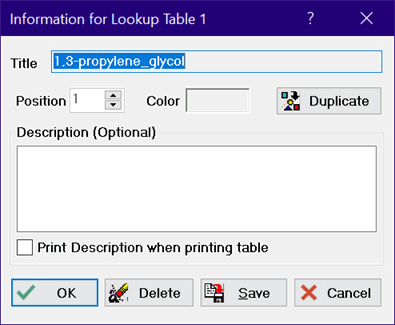 The dialog also provides a place to enter a description of a table for reference. The description can be printed when the table is printed.