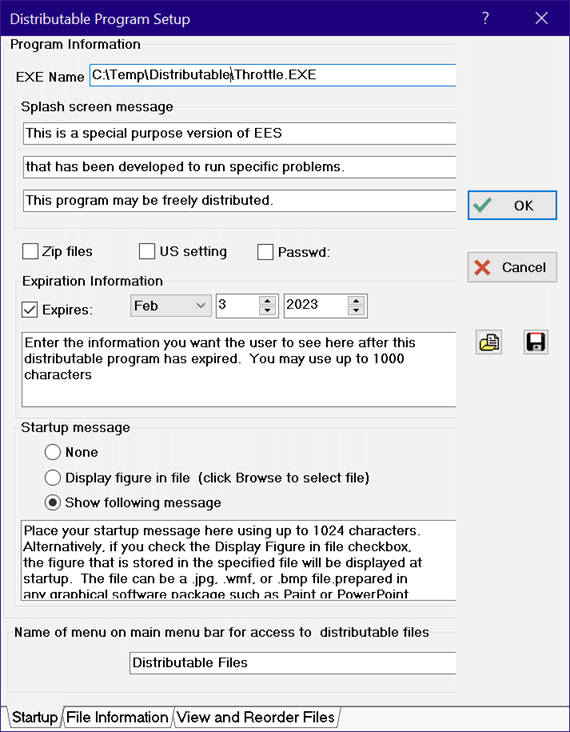 When the distributable program is started, it will display the EES splash screen with the 3 line message that you provide in this dialog. You can supply blank fields here, but that is not recommended.