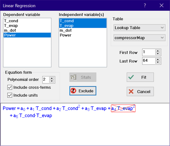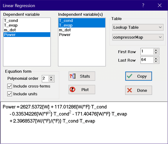 The Stats button will be enabled after the fit is completed. Clicking the Stats button will provide a table listing all of the coefficients, their associated standard errors, and other statistics such as the root-mean-square (rms) error, the bias error, and the R^2 value. The Exclude button will now become the Plot button. Clicking the Plot button will display a plot of the predicted values of the dependent variable versus the values in the table. The coefficients can be copied to the Clipboard by checking the Copy to clipboard control The Fit button will now be titled Copy and the Cancel button will be titled Done. Either button will dismiss the dialog window. The Copy button will first copy the fitted equation to the clipboard. You can then paste this equation into an EES worksheet. Note, however, that the Copy process will overwrite any other information in the Clipboard, such as the coefficients copied from the Regression Statistics dialog window.