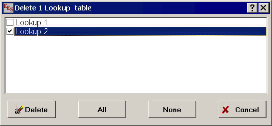 The Delete Lookup Tables command will present a dialog that shows a check box list containing all Lookup Tables in the Lookup Table Window. Select the Lookup Table(s) that you wish to delete by checking the box to the left of the table name. Click the All button to check all tables. Click the None button to uncheck all tables. The height of the list of tables can be increased or decreased by resizing the dialog. Checked files will be deleted when the Delete button is clicked. Note that deleted means that the specified Lookup table(s) will be removed from the EES file, i.e., the Lookup table will not be saved with other EES data when the EES file is saved. Tables that are deleted with this command cannot be restored with an Undo command. However, this command does not delete also delete a Lookup table file that has been saved using the Save Table command separated from the EES file.