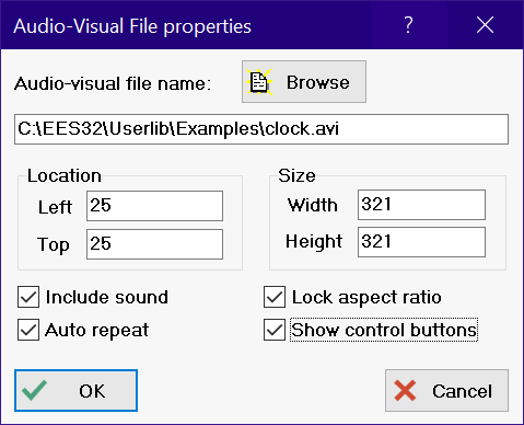 The Browse button facilitates selection of the audio-visual file. Any file that following the MDI interface should be acceptable, including files that have a .avi or .wav file name extension. If a movie file is selected, EES will automatically fill in the Width and Height of the movie. These fields can be changed. If the Lock aspect ratio button is selected, changing either width or height will result in an automatic change in the height or width to ensure that the original aspect ratio remains unchanged.