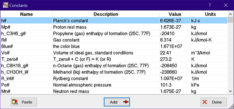 Note that constants have a # symbol as the last character in their name. The # symbol distinguishes constants from variables. String constants must have #$ as the last two characters in the name. Like variables, the constants can be used in the equations in the Equations window. Numerical constants may have associated units which are used when the Check Units command is applied. However, constants are not variables. Their values cannot be changed and they do not appear in the Solution window or in the Variable Information dialog. Constants are displayed with the value and units in the Formatted Equations window.