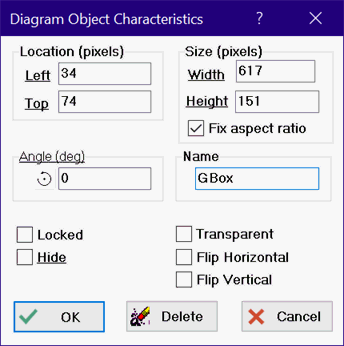 In the Professional license, the graphic object can be given a name. The name can then be used to assign attributes to the graphic item with EES variables in the Equation window or Parametric table. For example, the left and top of the item represented in the dialog below could be specified with EES variables GBox.left and GBox.top, respectively. If GBox.Hide is set to a non-zero (true) value, the object is not displayed. (Objects are visible and return to the location specified in the dialog when the Diagram window is in development mode). The values of EES variables that are used in this manner can be conveniently set using a Drop-Down list item. A common use for this capability is to have EES display one of several pictures, depending on the selection from the drop-down list. An example of this capability is provided in the Movable_Figures.EES example file. This example can be opened by selecting Diagram Window from the Examples menu and then selecting the Movable Figures item. A more powerful application of this capability is animation.
