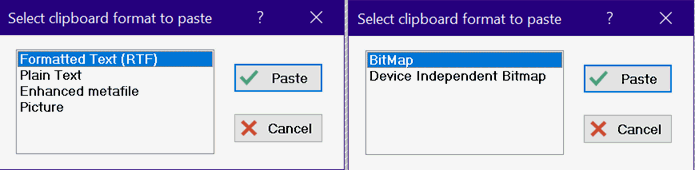 Enhanced metafile, Picture, Bitmap, and Device Independent Bitmap will all paste the selection into the Diagram window as a graphic, rather than editable text. It will not be possible to edit the text or graphics that is pasted. An advantage of this choice is that the selection will be pasted exactly as it appeared in the original program. The Bitmap and Device Independent Bitmap usually more memory. Enhanced metafile is the recommended choice, if it is available.