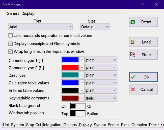 The Calculated Table Values and Entered Table Values pertain to the display of values in the Parametric Table. Entered table values are values that are provided by the user, either directly by typing the value or indirectly through application of the Alter Values dialog. Calculated values are provided by EES during the Solve Table or Min/Max Table commands. Two fields are provides for each category to set the color and the font style of the display. Note that a separate font style can be selected for printing in the Printer Preferences tab.