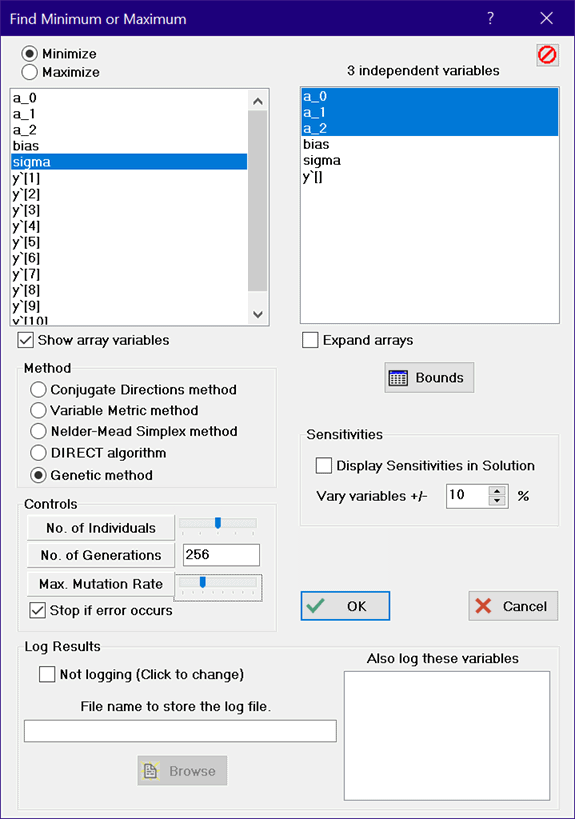 Unlike the Conjugate Directions and Variable Metric methods, the genetic method is not affected by the guess values of the independent parameters. However, the lower and upper bounds on the independent parameters are extremely important since the initial population and subsequent stochastic selections are chosen from within the bounds. Use care in selecting the bounds.