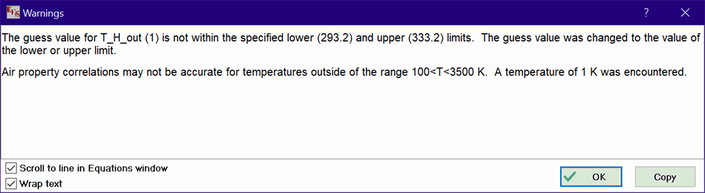 Non-redundant warning messages that were generated during the calculations are displayed. If the Scroll to Line in Equations window check box is checked, then EES will highlight the equation in Equations window that generated the warning, scrolling the display in the Equations window as necessary.