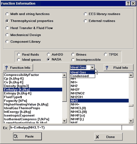 The NASA ideal gas and condensed data can then be used in EES property functions in exactly the same manner as for the built-in ideal gases. The unit system for which properties such as temperature and pressure must be supplied and properties are returned is specified with the Unit System dialog or the $UnitSystem directive. The thermal properties are often most useful when expressed on a molar basis, which can be set with the choice of the unit system. Examples uses of the NASA substances with the EES property routines are: