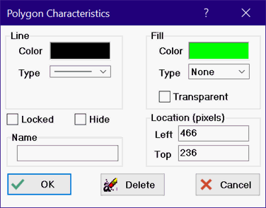 . The drawing process is identical to the process for drawing a polyline, except that the drawing process is concluded by clicking on the first point, which is marked with a circle. Alternatively, double-clicking the left mouse button or pressing the Enter key will cause the cursor to move from the last entered point to the first point to form an enclosed area and conclude the drawing process. The enclosed area will, by default, be shaded in lime color. The characteristics of the polygon can be changed by double-clicking anywhere within the enclosed area or by right clicking and selecting the Properties menu item from the pop-up menu. Either action will bring up the following dialog.
