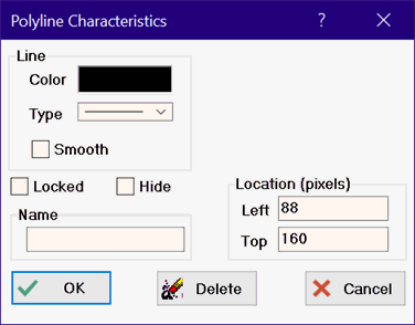 The properties of the polyline can be changed when the toolbar is visible by either double-clicking the mouse while it positioned on a line or vertex. Alternatively, position the mouse on a line or vertex and right-click. Select Properties from the pop-up menu. The following dialog will appear for the Diagram windows. The locked and Name options are not available for the Plot windows.