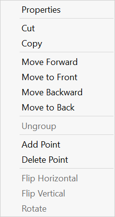 Additional points can be added to the polyline and a selected point can be moved deleted. To delete a point, move the mouse cursor over a point. It will be displayed as a filled box. Right-click on the point and a pop-up menu will appear. The following pop-up menu is applicable to the Diagram window. A very similar pop-up menu is displayed for the Plot windows.