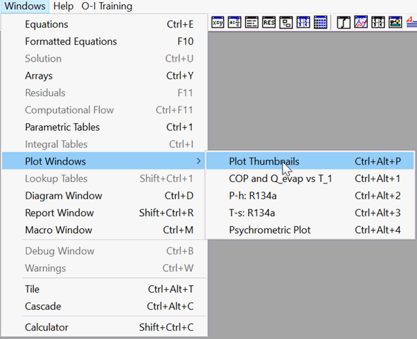 2. From the Windows menu, select Plot Windows. A fly-out menu will appear with Plot Thumbnails at the top, as shown. Select this menu item.