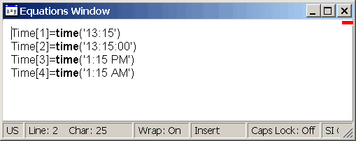 The Time function accepts a string constant or string variable representing a time and converts it into a number. Time are internally stored as a real number,normally ranging between 0 and 24. The Time function accepts the string representation of the time in several formats as illustrated in the following example.