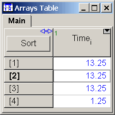 After running this program, the Arrays table will appear showing the numerical equivalent of the entered values of time. The entries are displayed as decimal because the display format for the Time array is initially set to Auto, which is a numerical format.