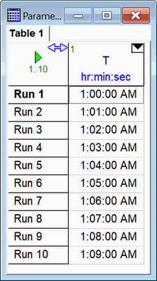 The values in the table can be displayed in a chosen time format. To change the display format for the values in any table, right click in the header cell column and select Properties from the popup menu. The Format Arrays Table dialog will appear. Use the arrow in the Style box to change the format style to Time. Then select a time format from the control to the right of the Style box.