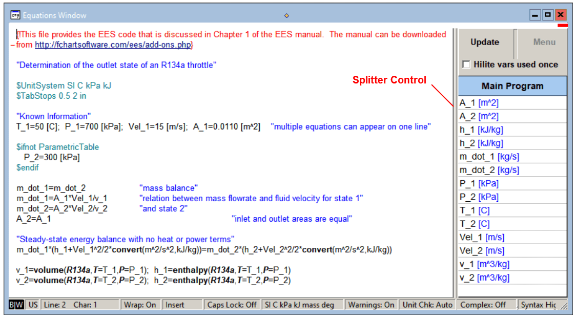 The width of the palette can be adjusted by dragging the Splitter Control to the desired position. Dragging the splitter bar all the way to the right of the window frame disables the palette. The width of the palette is saved in the EES file. When EES is restarted, the width of the palette will be the value it was when EES was last used.