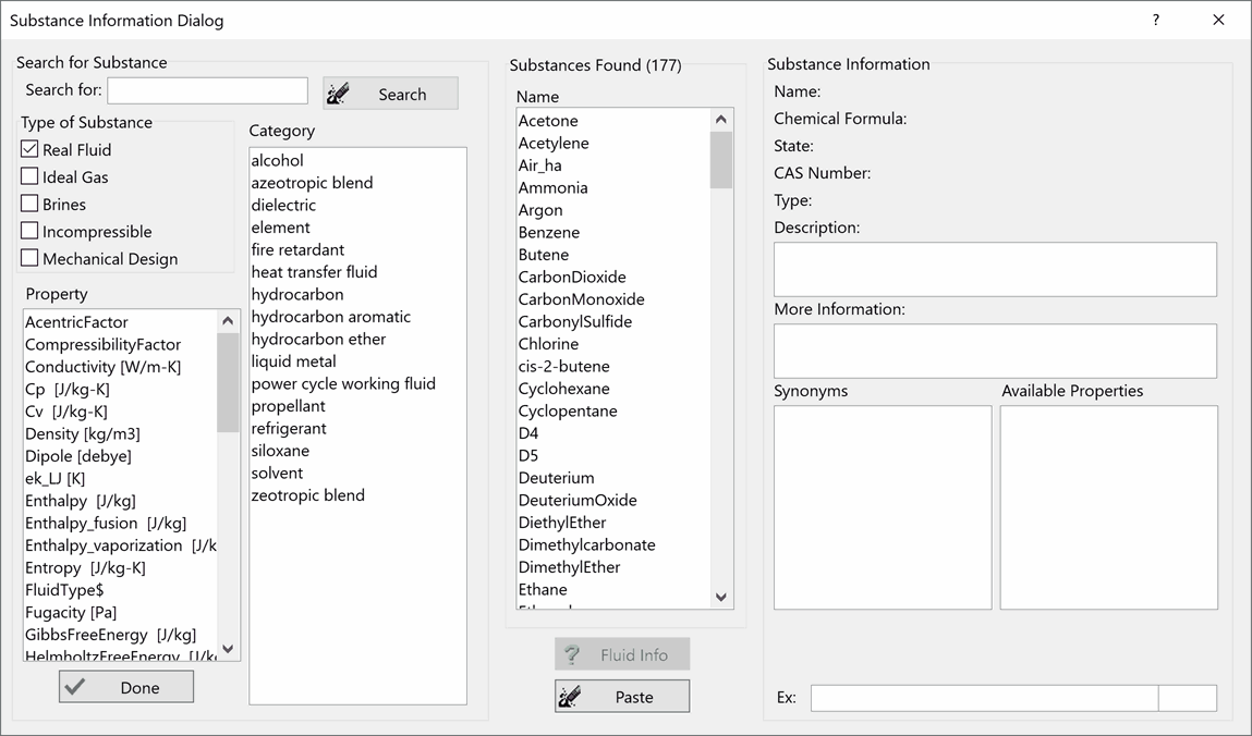 The left hand box allows you to create a search for a substance. Click one or more of the substance type check boxes in the upper left hand corner to filter your search by substance type. The types correspond to Real Fluids, Ideal Gases, Brines, Incompressible, and Mechanical Design. Based on the type of substance selected the two list boxes to the left will be populated. The left box vides a list of properties available and the right box provides a list of categories. By making selections in either of these boxes you can filter the list of substances that appear in the Substances Found box. For example, selecting the Incompressible type box, the P_sat function and the eutectic category provides a list of incompressible substances that are classified as eutectics and have the saturation pressure property available. Note that multiple properties or categories can be selected to further refine your search. Holding down the Ctrl^ key while making a selection will undo that selection.