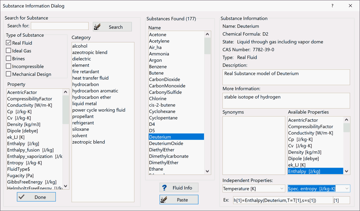 Selecting any of fluids in the Substances Found box will populate the right hand box with information about that fluid. The information includes its name, chemical formula, state, CAS number, and type as well as a description of the substance and any additional information or synonyms. The Available Properties box lists the properties that are available for that substance. Selecting the Fluid Info brings up help that provides more information for the substance. Selecting any of the properties will cause the Example edit box to be filled with an appropriate function call for that property and substance. When multiple independent properties can be selected the drop down menus that appear can be used to select the two of interest. Adding a label in the edit box to the right of the Example box will cause that label to be applied to the property and independent variables, as shown below.