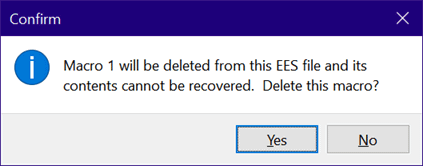 The Close button at the right of the Macro Window title bar closes (hides) the Macro Window, but does not affect the macro files. The visibility of the Macro Window can be restored by selecting Macro Window from the Windows menu. To close a tabbed Macro file, either right-click on the tab and select Close Macro or click the X button on the toolbar. (You can also select the Close/Delete command in the Macros menu.) The action taken depends on whether the macro is set to be saved with the .EES file or in a separate .emf file. If it is set to be saved with the .EES file, the macro file will be deleted. The contents of the file will be lost. A confirmation that you want to delete the file will be presented.