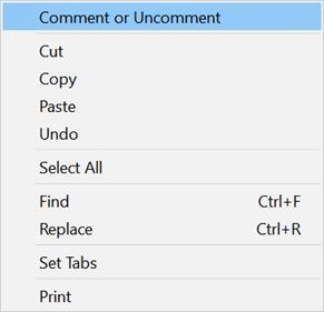 Note that text following // is considered to be comment up to the end of the current line. Selected lines can be commented or uncommented by clicking the right mouse button and selecting the Comment or Uncomment menu command in the popup menu.