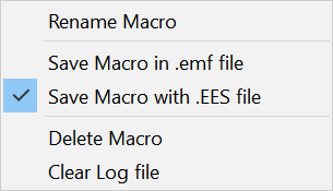 Right-clicking on a tab in the Macro Window will bring up a popup menu providing the options to Rename, specify how the macro is saved, Close or Clear the log file for the selected macro, as shown below.