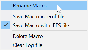 As of version 10.688, macro files can be saved with the.EES file, rather than in separate .emf files. By default, new macros are set to be saved with the .EES file. To save a macro in a separate .emf file, select the Save Macro in .emf file command. A check mark will be displayed to the left of the menu item showing which save option is selected. Also, if a macro is set to be saved in an .emf file, the .emf filename extension will appear in the tab name. References to the macro should use the same name as displayed in the tab. If the macro is set to be saved with the .EES file, then all of the information relating to the macro will be saved when the .EES file is saved and restored when the macro is opened. This option is convenient as it eliminates the need for providing and opening separate .emf files.