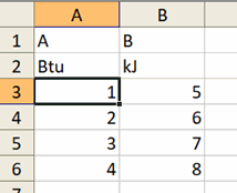 EES can read EXCEL .XLSX or .XLS files. If the first row in the file contains string information, EES will interpret that row to be the name of the columns that appear in the Lookup table header. If the second row contains string information, it will be interpreted as the units for the data. EES can save a Lookup table in .XLSX format. The first row in the save file will contain the names of columns and the second row will contain the units. If units are not specified, the second row will contain blanks. Data begin on the third row, as shown below.