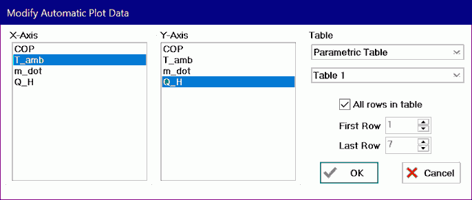 When a plot line is first constructed, the table, data columns, and range of rows that provide the data to form the plot must be selected. At some later point, it may become necessary to change these data. The Modify Automatic Plot Data dialog provides this capability.