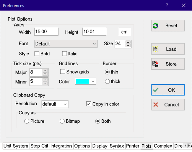 The default characteristics that may be set are the plot width and height, the font, font size, font style, grid line visibility and color, and the major and minor tick sizes for the axis scales. The plot width and height can be entered in cm or in. Click on the unit designation to toggle between these choices. Regardless of the unit choice, the plot width and height inputs are converted to pixels and stored as an integer value. EES will automatically adjust the size to the resolution of your monitor.