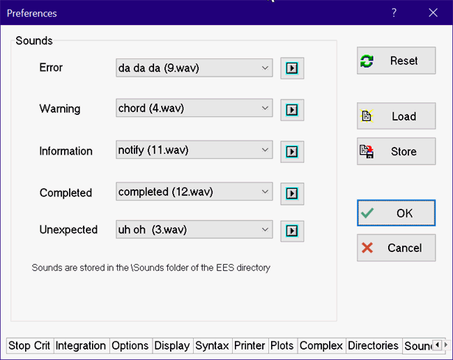 All of the sound files (except none and beep) are provided with .wav files that are stored in the Sounds folder within the EES directory. A total of 15 different sounds are provided. User-selected sound files may be substituted in place of the existing sound files by renaming them n.wav (where n is an integer between 2 and 15) and copying the file into the Sounds folder, thereby replacing the existing sound file.