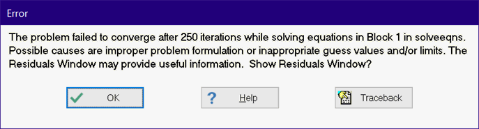 EES normally highlights the equation in the Equations Window that caused an error. However, when an error occurs in an internal Function, Procedure, or Subprogram, it is often helpful to know where the routine was called from. This is particularly true if the routine was called from another Function, Procedure or Subprogram. When this situation occurs, EES will display a Traceback button in the error message dialog. A simple example is provided below.