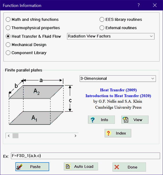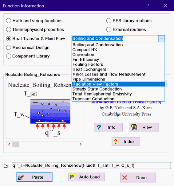 Clicking the Heat Transfer, Mechanical Design, Component Library or User-Defined buttons provides access to information on EES application libraries. The major categories in each application type appear in the drop-down list to the right of the button. For example, selecting the Heat Transfer button will cause a drop-down control to appear listing all the categories in the Heat Transfer library, as shown in the figure on the left. The figure on the right shows the result of selecting Radiation View Factors category.