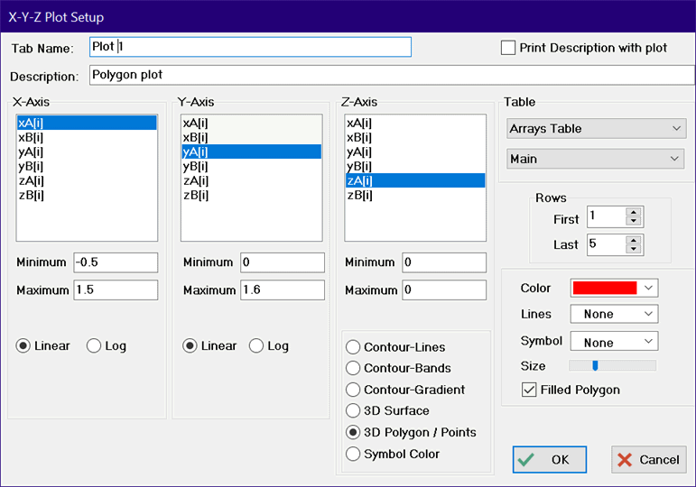 The 3D Polygon/Points plot will plot a three-dimensional representation of tabular data provided in three separate columns of any of the tables. This option is only available in the Professional license. Clicking the 3D Polygon/Points button will change the display as shown in the following figure.