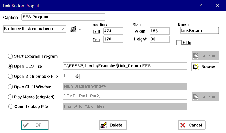 A Link button can be placed on the Diagram window that, when clicked, will display the familiar Open File dialog. A user can then select a Lookup file having a filename extension of .LKT (or LKT64 for the 64-bit license), .TXT, .CSV, .DAT, .XLSX (EXCEL file) and that Lookup file will be opened. After the selection has been made, an EES string variable having the same name as the caption of the Link button is created and its value is set to the name of the Lookup table that has been read in. EES does not allow spaces in a variable name so any spaces in the caption are set to underscores. Also, the maximum length of the variable is 29. The last character of the EES variable name is set to $ to indicate that it is a string variable. As an example, if the caption of the Link button is "Open Lookup File", clicking the button will read the file, create variable Open_Lookup_File$ and set the value of this variable to the name of the Lookup table that was created. This string variable can be used in subsequent Lookup file function calls. If the Lookup table already exists, it will not be re-read.